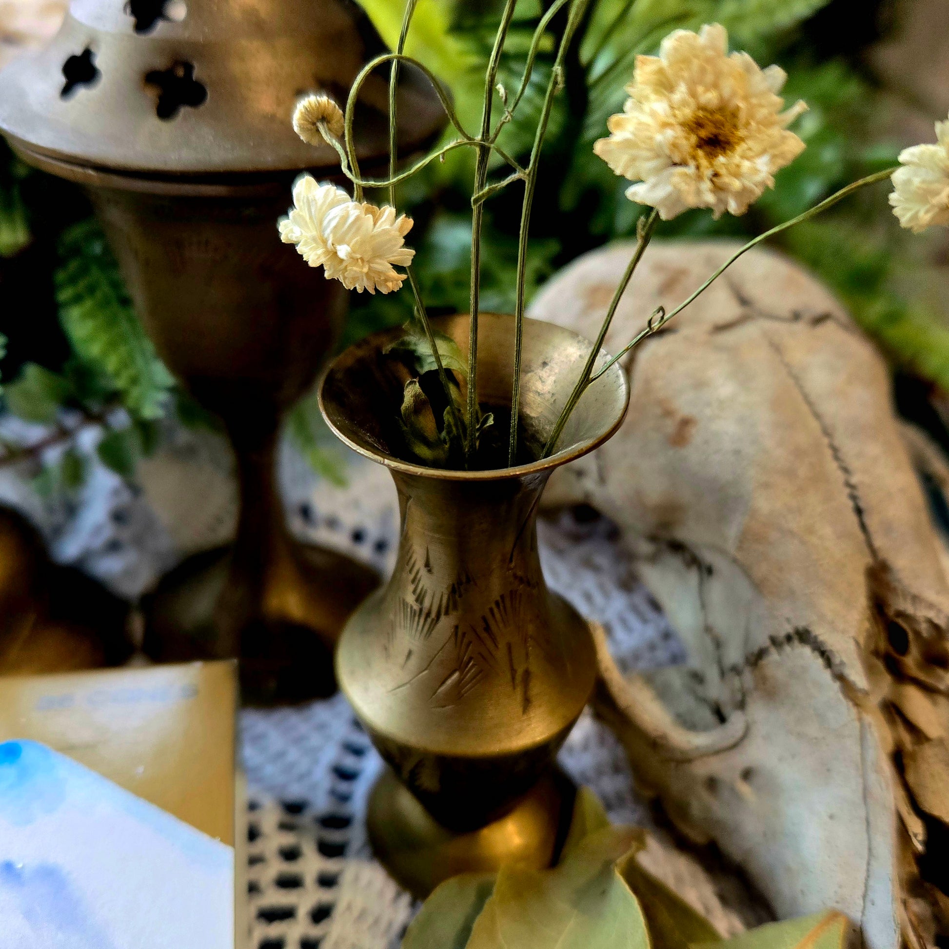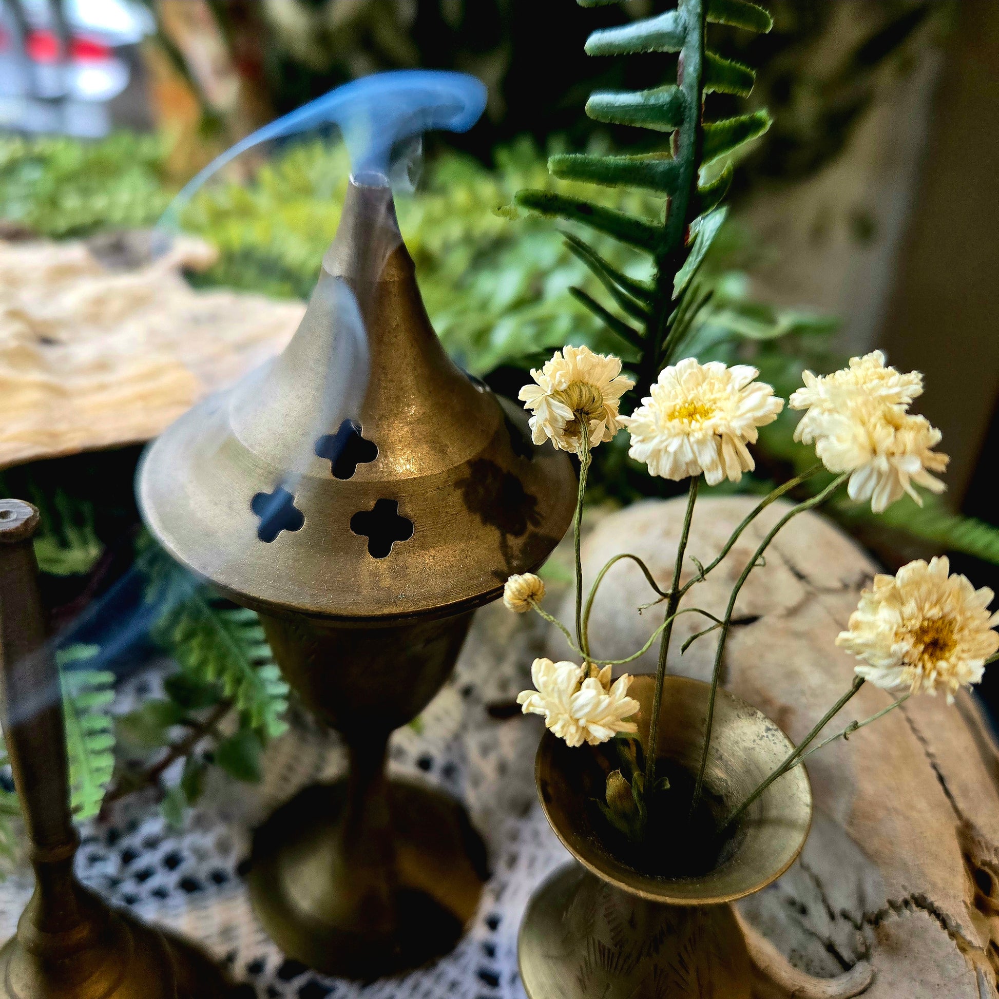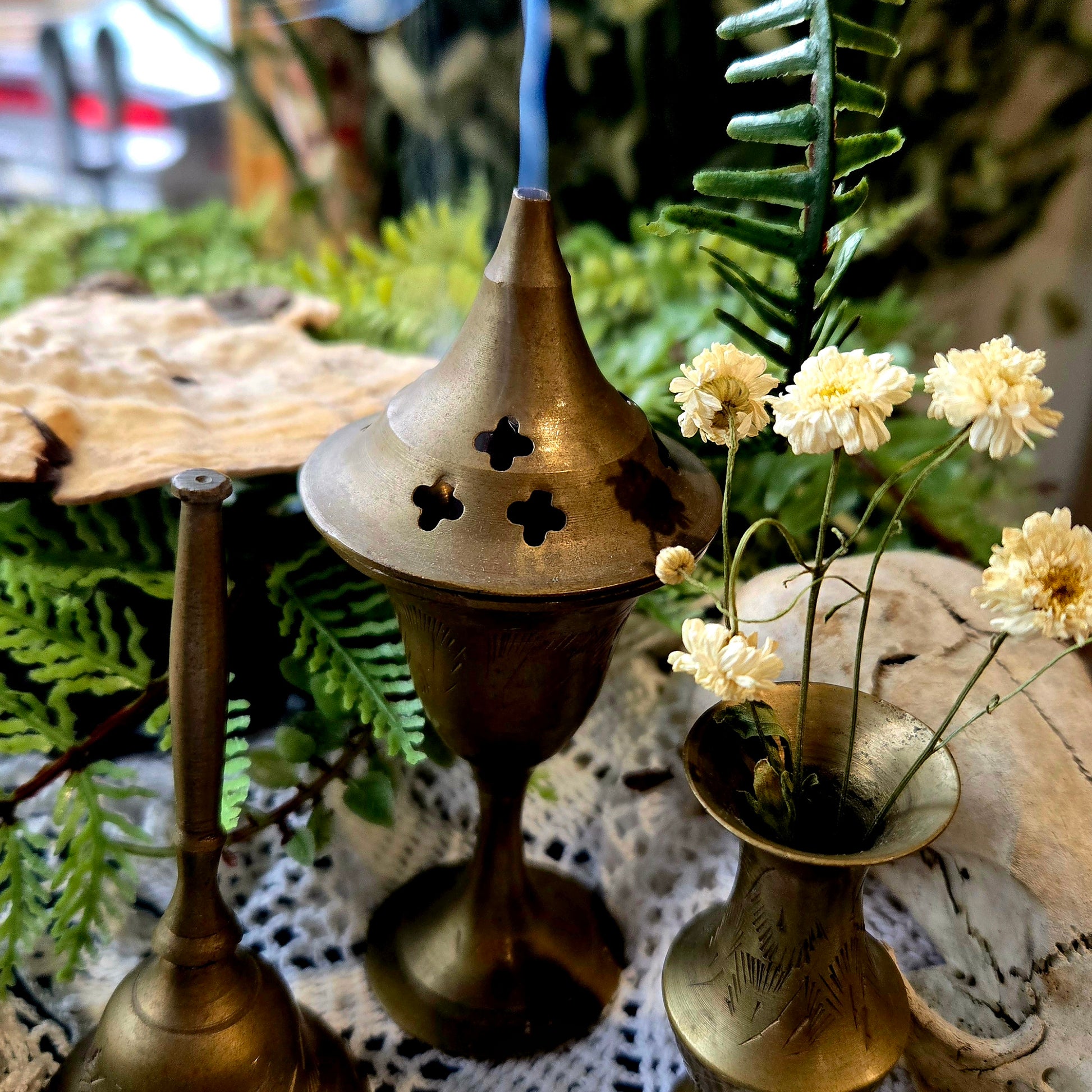 A sacred trio of brass ritual tools paired with elemental offerings to awaken the senses and deepen your practice.