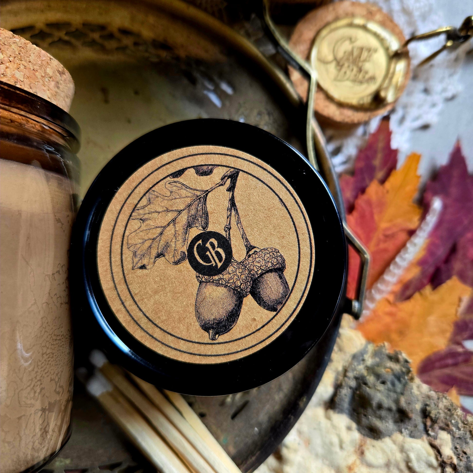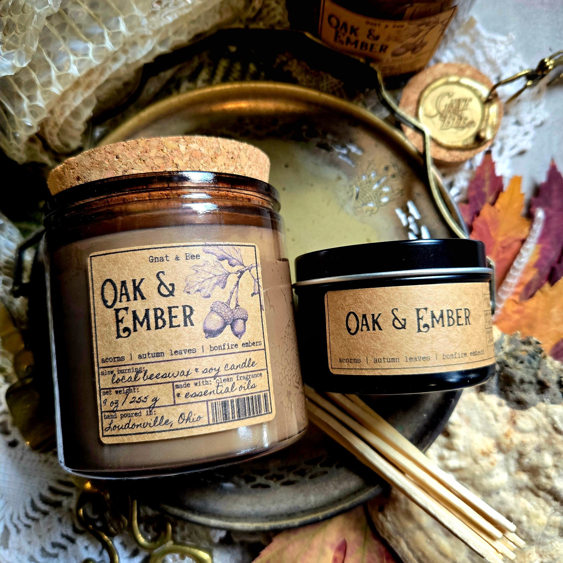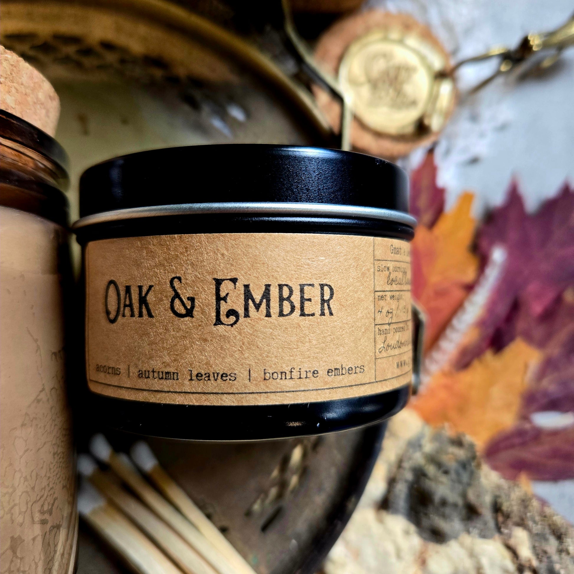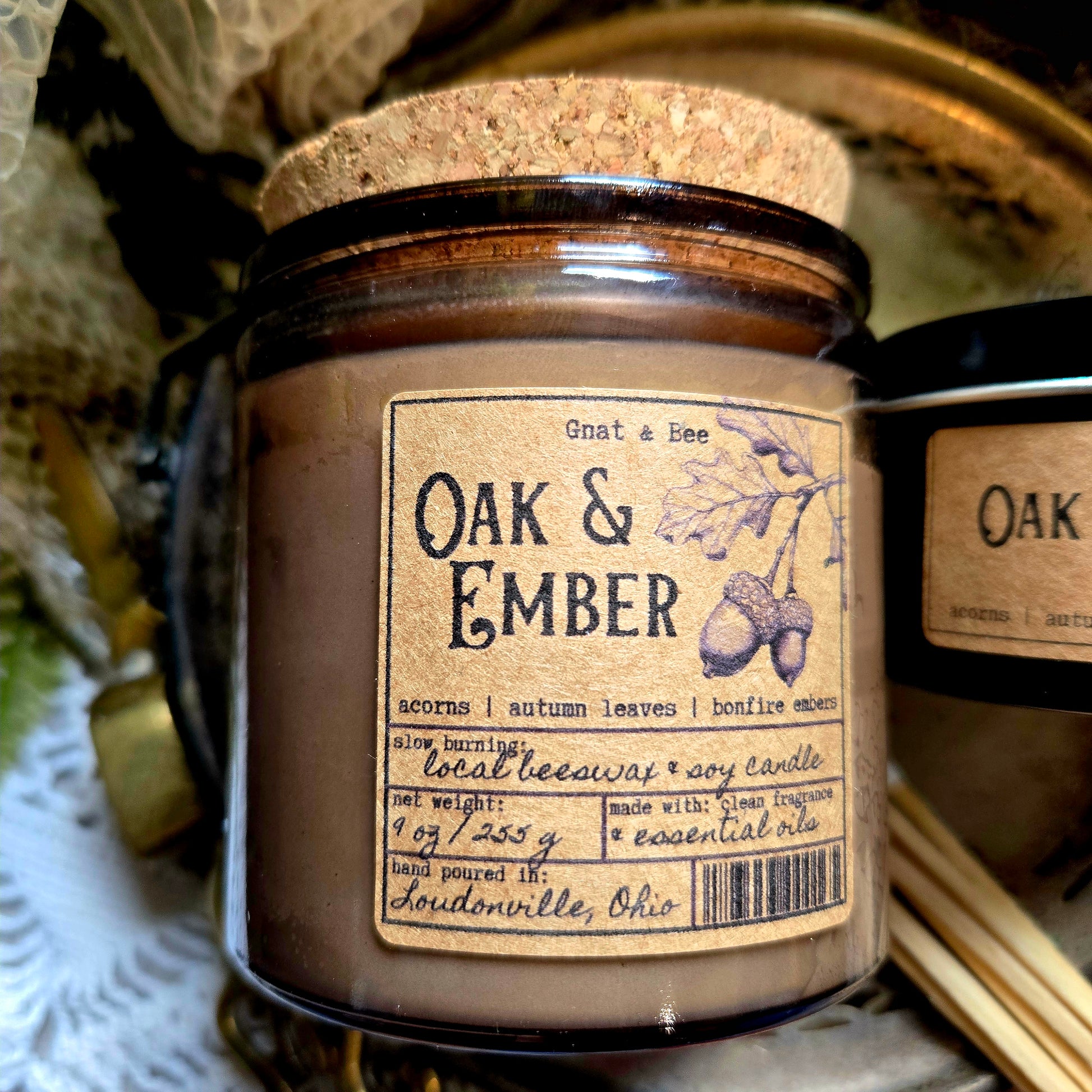 Oak & Ember captures a quiet moment in a hidden wood, where the air is still and the old trees guard their secrets. This scent tells a tale of dry, rich fallen oak and maple leaves, and earthy buttery acorns. Subtle and not sweet, it is a fragrance of deep antiquity and quiet moments. The heart of this candle holds a smokey memory of a distant bonfire, with a base of warm sandalwood and dark patchouli that grounds the scent like ancient roots.