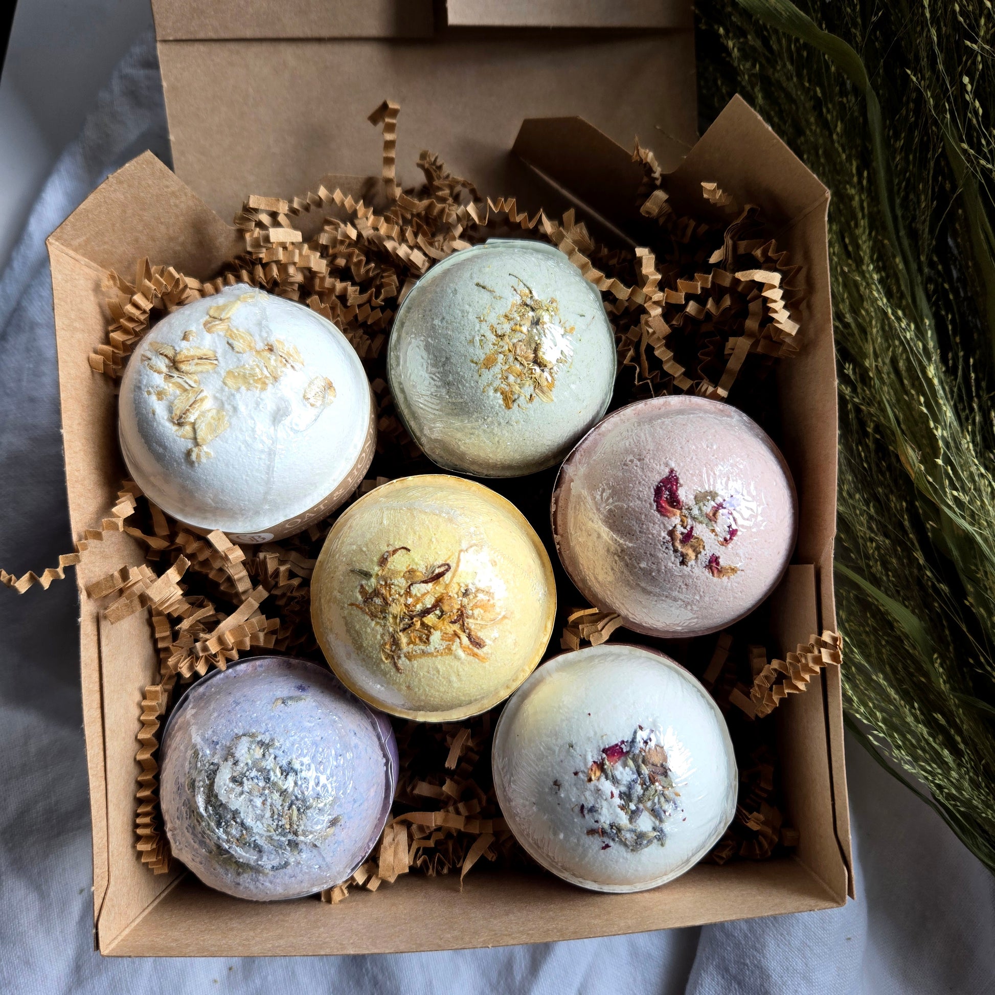 Gift set of 6 all natural bath bombs, nestled in crinkle paper, in a kraft box. Then we tie it up with twine or ribbon.
