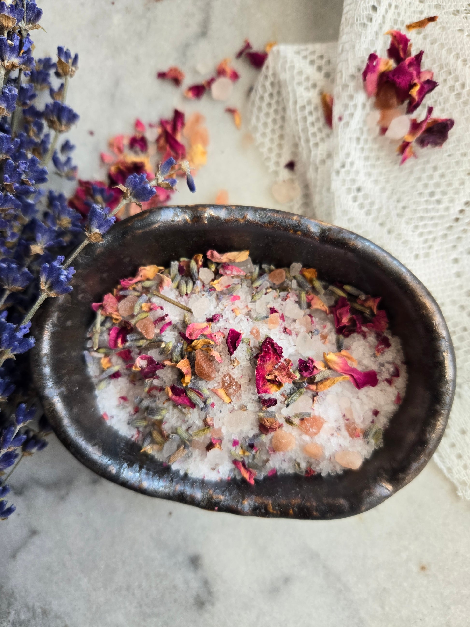 Ingredients: Magnesium sulfate Epsom salt, pink Himalayan salt, roses, lavender, and essential oils of geranium, lavender, cedar wood.