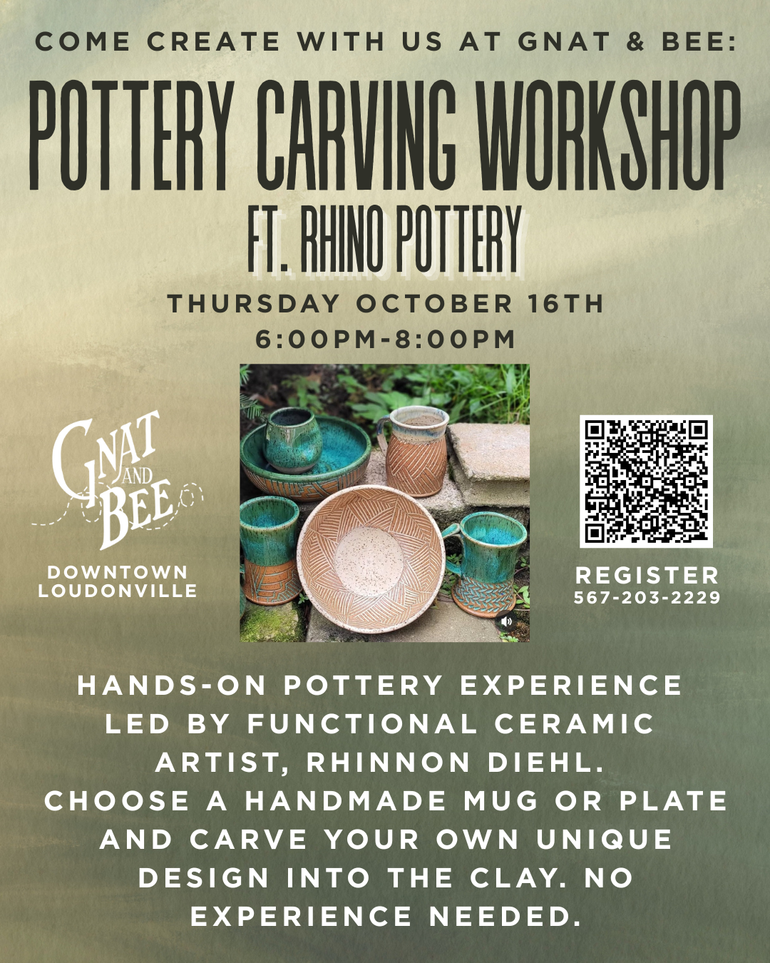We'll provide all the tools and materials you'll need. After class, your piece will need time to dry, be fired in the kiln, and glazed. We'll notify you when your finished piece is ready for pickup, typically about one week later. Pick up locations include Gnat and Bee in Loudonville, or from Rhino in Wooster.