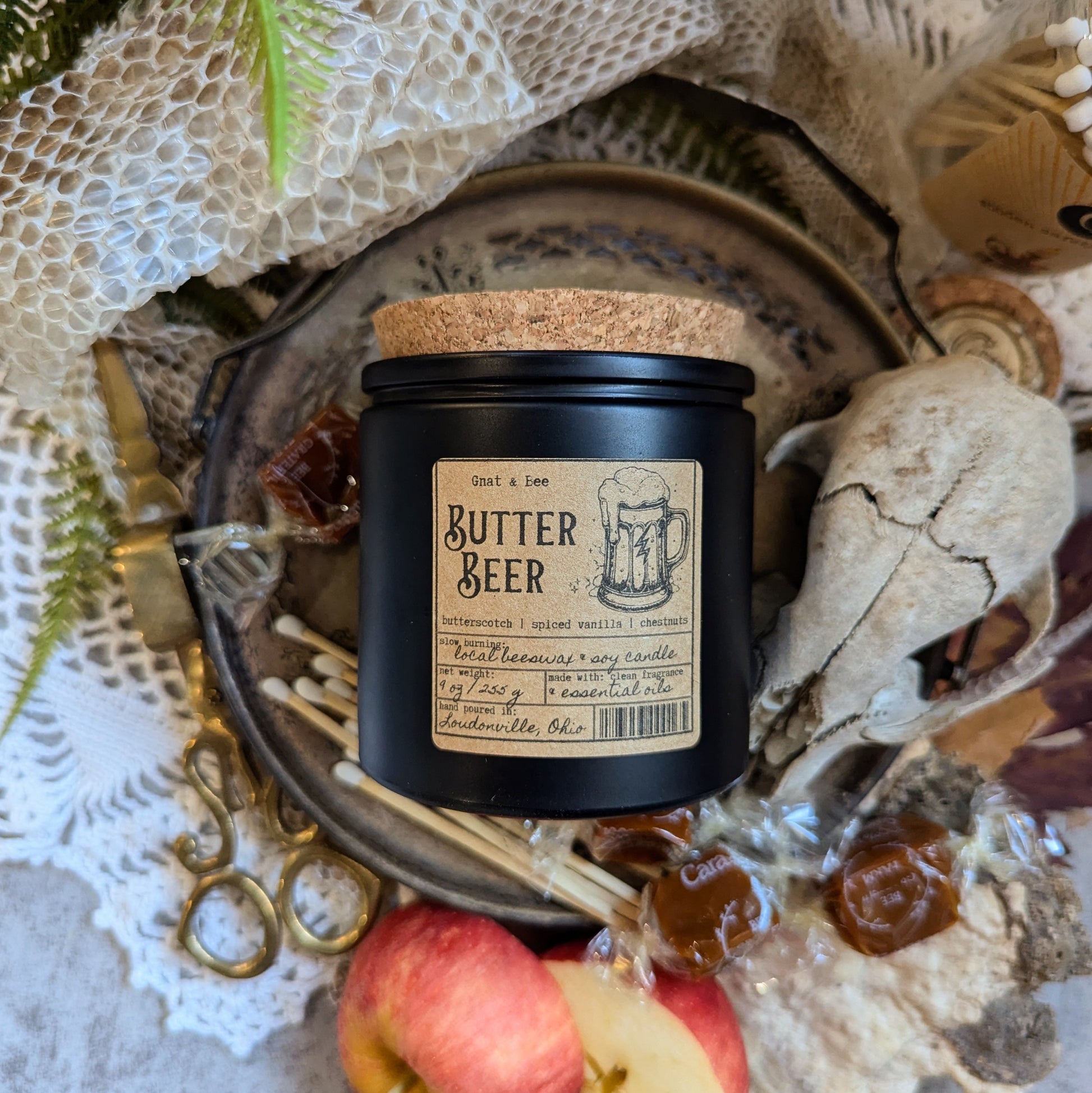 Step into the warmth and cheer of a hidden tavern on a chilly night. Our bespoke, limited-edition Butterbeer candle is a magical brew, crafted to conjure the rich, comforting froths of the wizarding world. It is the perfect flame to light for either a cozy night in reading a tale to get lost in, or also for getting rowdy playing games with friends. This scent begins with the nostalgic sweetness of butterscotch and the warm nutty embrace of roasted chestnut. A heart of rich honey and maple mingles with a subtle hint of peach, casting a warm, comforting spell. As the flame burns down, it reveals a base of dark brown sugar, spiced warmth, and rich vanilla.