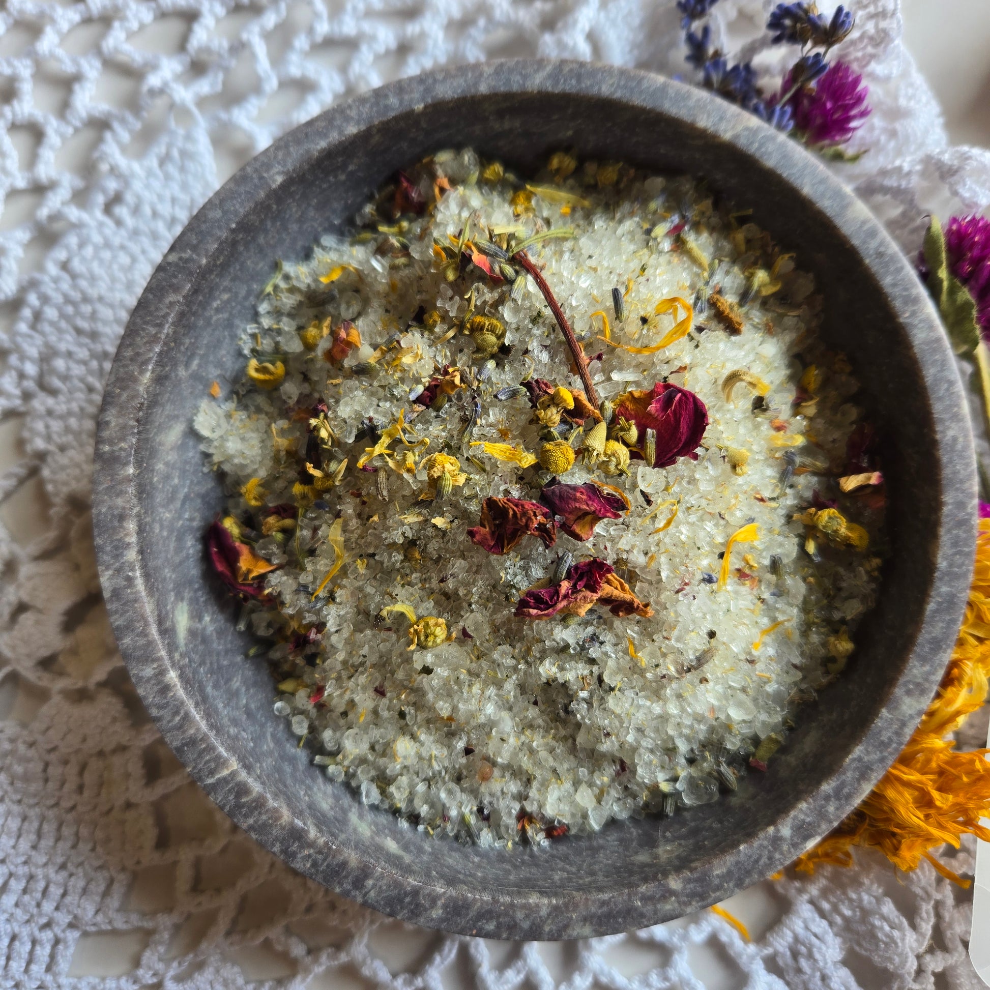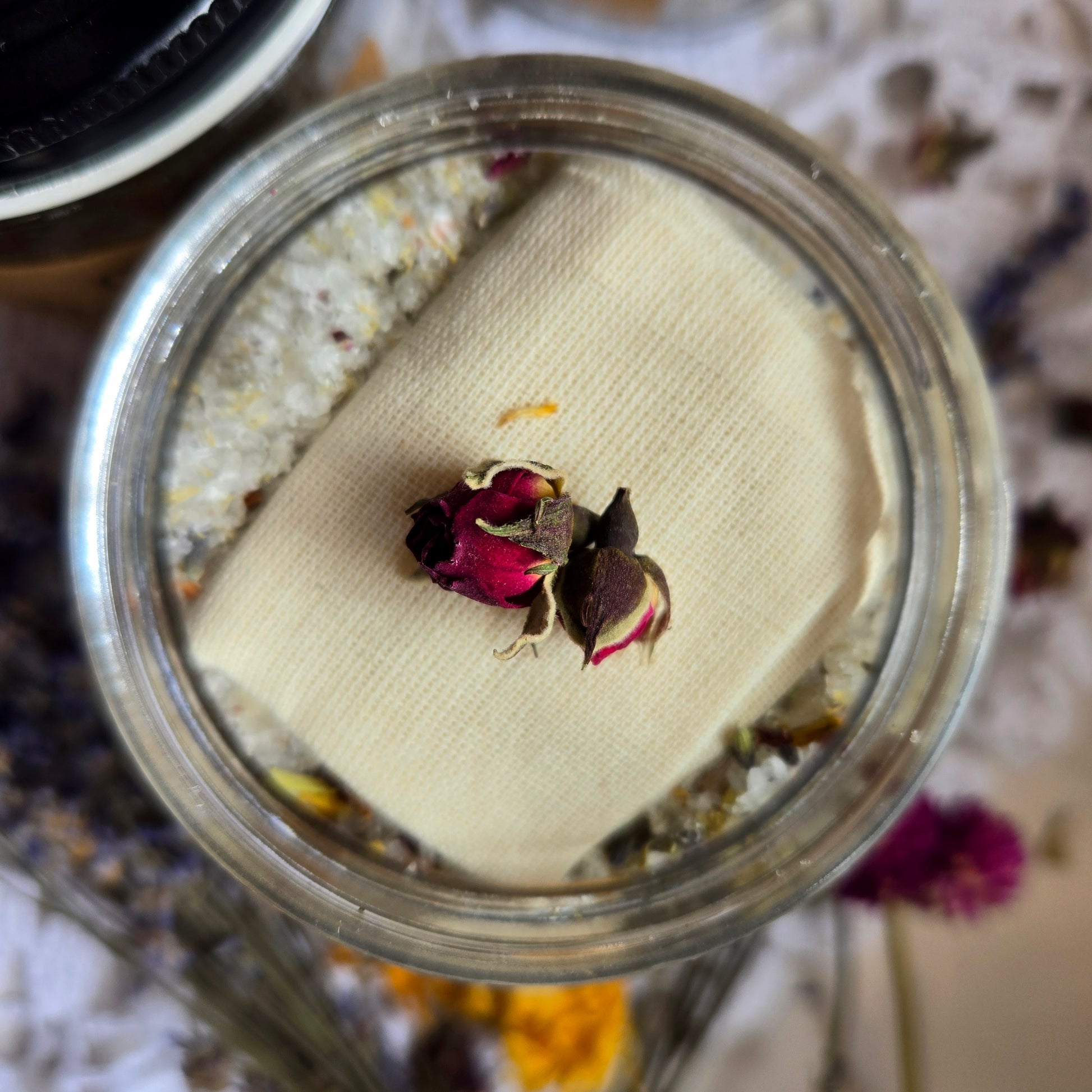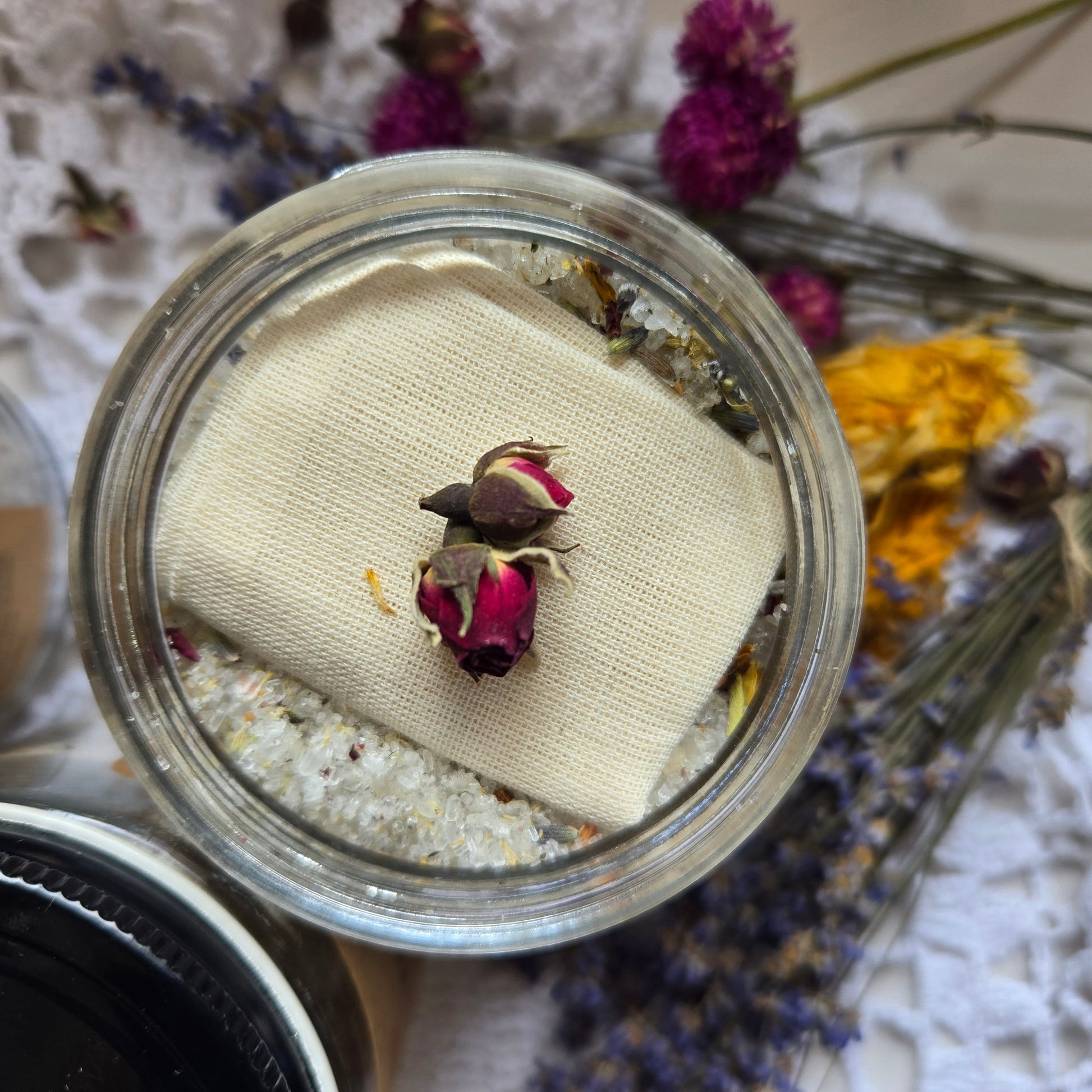 Botanical bath soak. A calming and detoxifying blend to help you unwind filled with garden florals & Dead Sea salts. Soften and moisturize skin, soothe sore muscles, relax the body & mind.