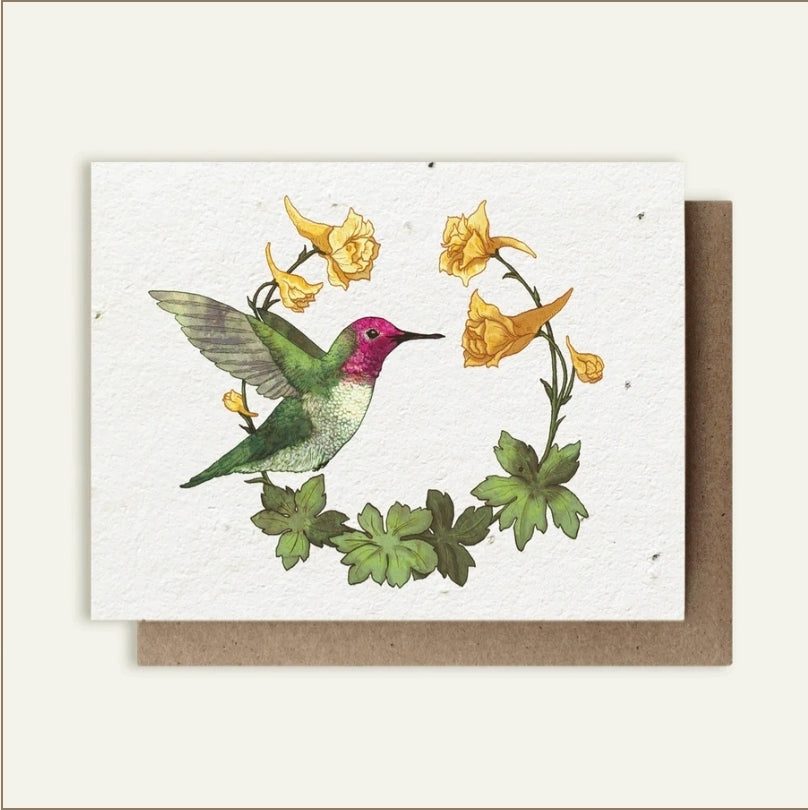 These plantable cards feature original nature art and are printed on seeded paper made from post-consumer waste. Blank inside, and the back has information about the front art, seeds and planting instructions.