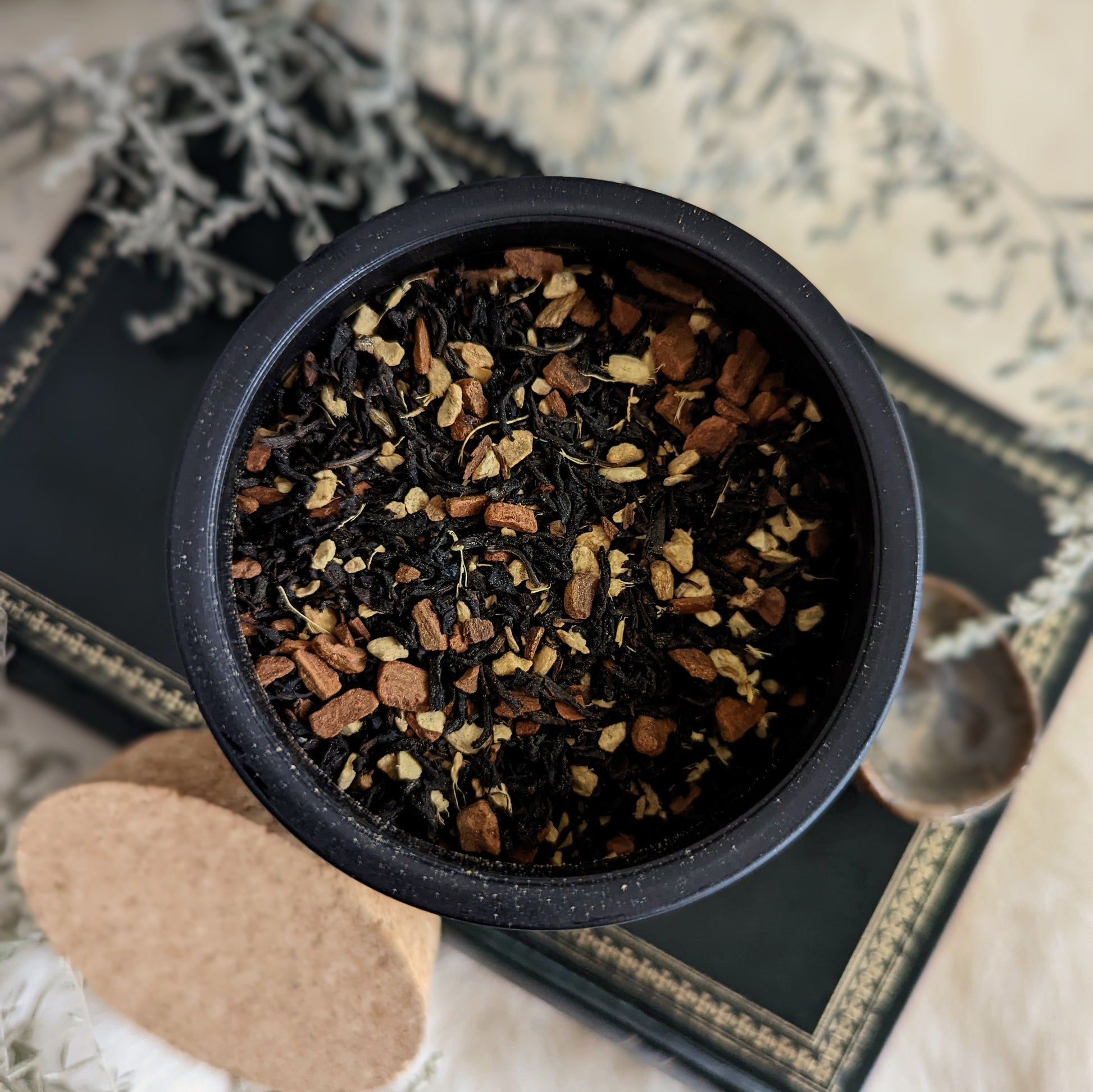 Indulge in this bewitching black tea blend, bursting with spicy and sweet flavors to soothe your soul and awaken your senses. Crafted from freshly ground spices, it's the perfect addition to your daily tea rituals. Elevate your experience by turning it into a luxurious tea latte with your choice of creamy milk and a hint of maple syrup or honey.