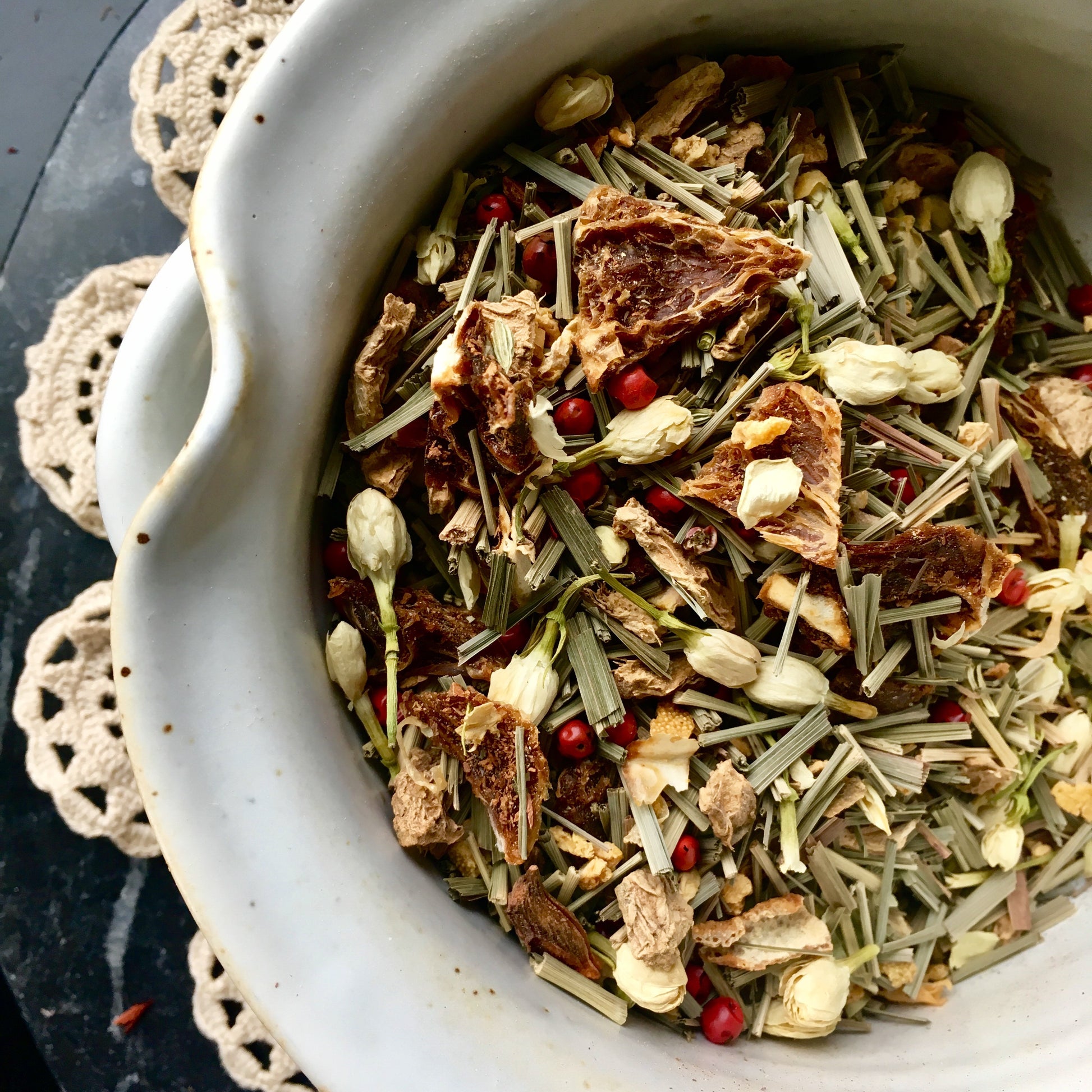 Ingredients: *Lemongrass, *orange peel, *jasmine flower buds, *ginger, *korintje cinnamon chips, pink pepper, star anise and fennel seeds. *organic